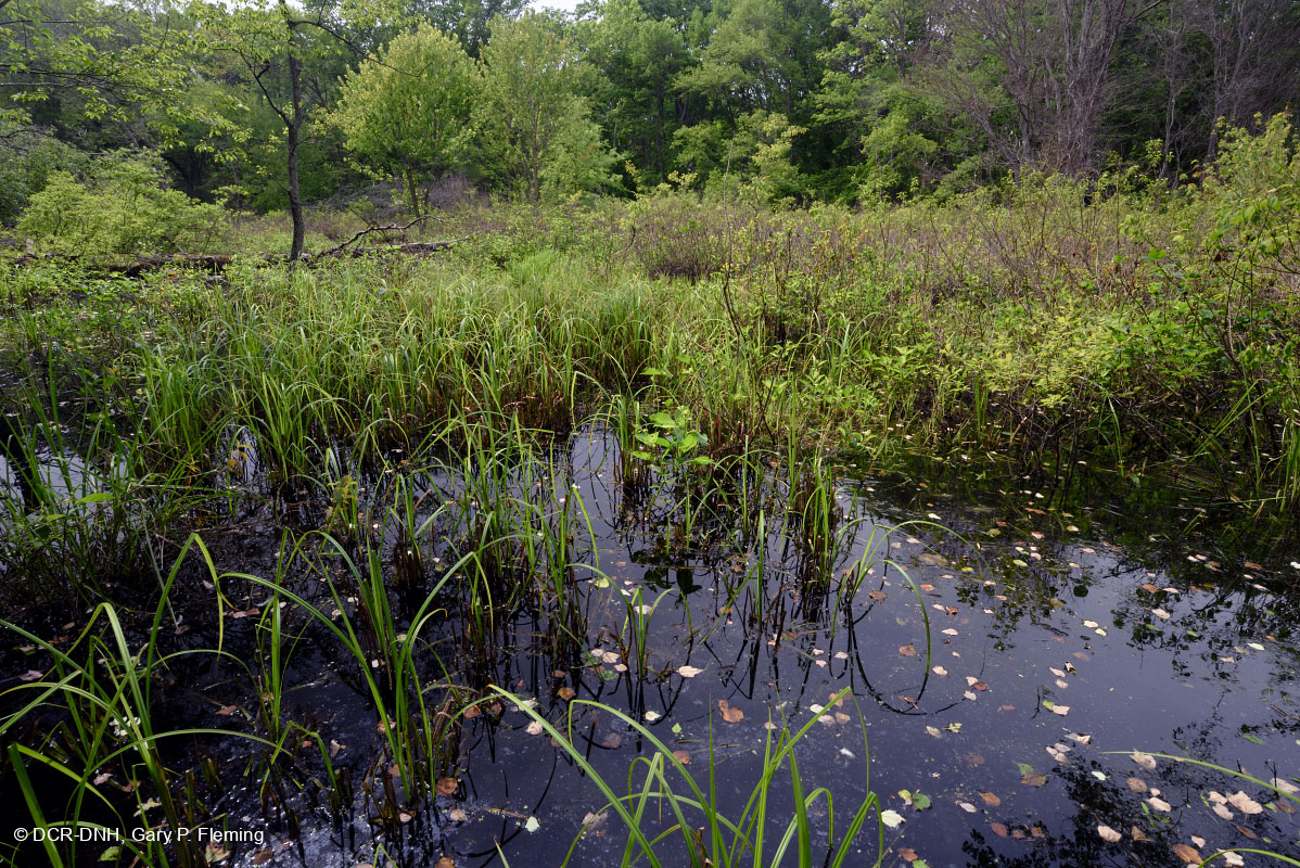 Cây cói hoa bia (Carex lupulina) và cây nút (Cephalanthus occidentalis) mọc dày đặc trong một ao nước ngập sâu theo mùa ở chân phía tây của Núi Turk, gần Crimora, Quận Augusta. © DCR-DNH, Gary P. Fleming