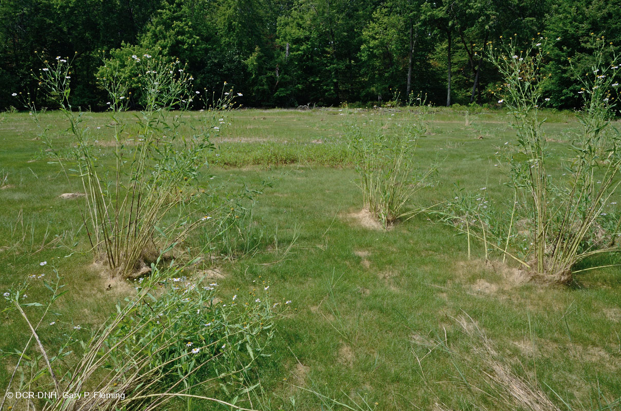 Hoa cúc búp bê thung lũng (Boltonia montana) mọc trên "bãi cỏ" cói lá kim (Eleocharis acicularis). Ao chia tầng, khu phức hợp ao sụt Maple Flats gần Sherando, Quận Augusta. Khu bảo tồn Glenwood-Pedlar, Rừng quốc gia George Washington và Jefferson. © DCR-DNH, Gary P. Fleming