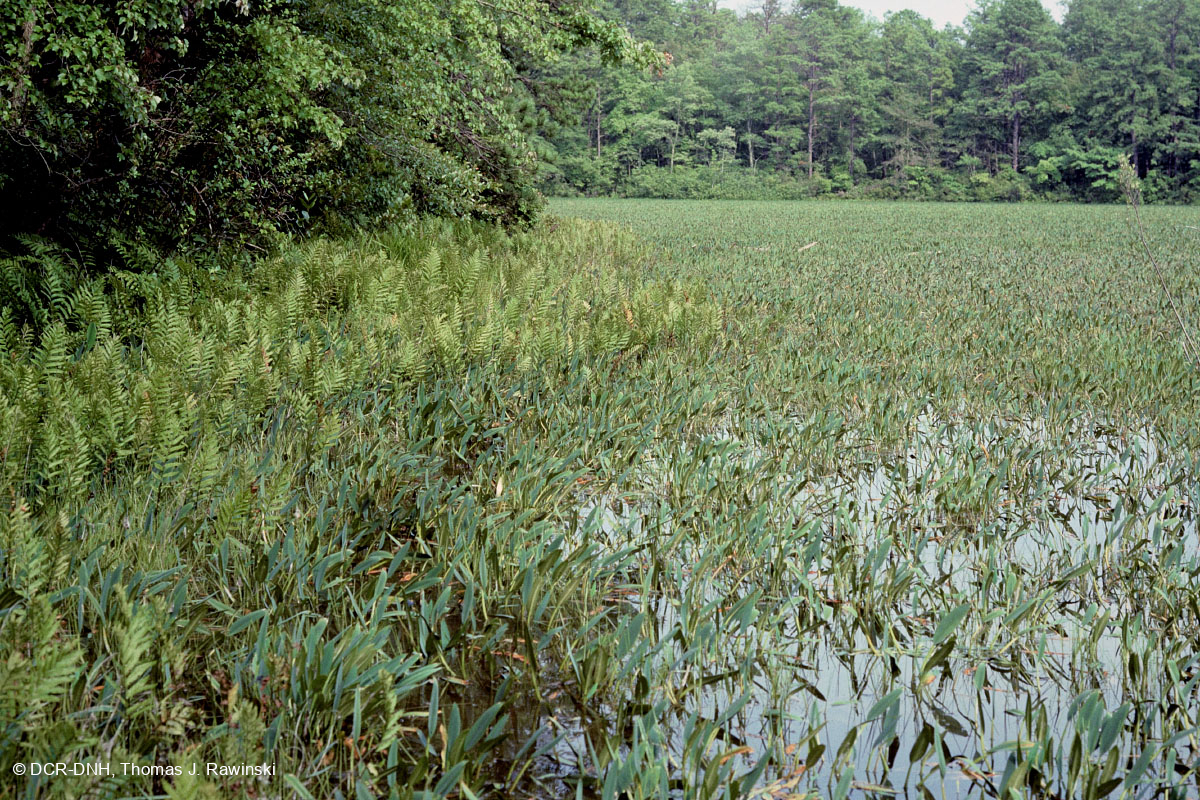 Spring Pond, một lưu vực rộng 5mẫu Anh, bị ngập vĩnh viễn, được cung cấp nước từ suối trong quần thể ao sụt Maple Flats, có nhiều loài thủy sinh như cây cóc vàng (Orontium aquaticum) và cây cỏ mực (Schoenoplectus subterminalis). Bức ảnh được chụp vào tháng 8 1992, trước khi có sự quấy nhiễu lớn của loài hải ly. © DCR-DNH, Thomas J. Rawinski