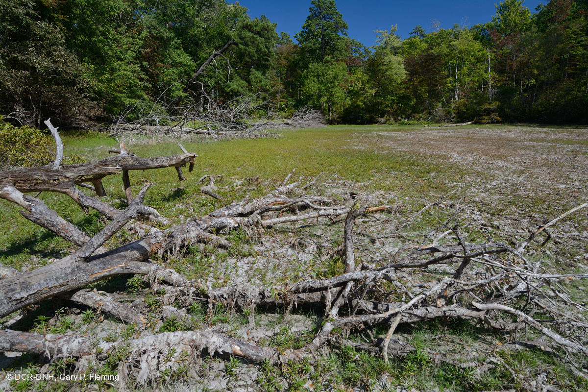 Đáy của ao hố bị ngập lụt bán vĩnh viễn sau một mùa hè đặc biệt khô hạn; cỏ nàng tiên cá thông thường (Proserpinaca palustris) chiếm ưu thế trong thảm thực vật kéo xuống. Khu phức hợp ao sụt Love's Run gần Greenville, Quận Augusta. Quận Glenwood-Pedlar Ranger, George Washington & Rừng Quốc gia Jefferson. © DCR-DNH, Gary P.Fleming