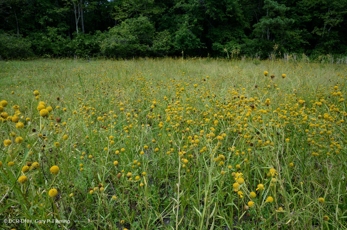 Thân cây có quả của cây kim ngân Virginia (Helenium virginicum) chiếm ưu thế hoàn toàn ở khu vực cuối mùa hè của Hồ Mount Joy gần Quán rượu Steeles ở Quận Augusta. Khu bảo tồn thiên nhiên tiểu bang Mount Joy Pond. © DCR-DNH, Gary P. Fleming