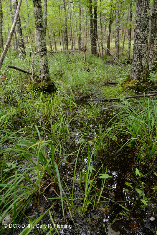 Cói (Care x gynandra và Carex lupulina) trong một đầm lầy lõm có rừng ở thung lũng giữa Núi Patterson và Núi Price, phía đông nam Oriskany, Quận Alleghany. Quận James River Ranger, George Washington & Rừng Quốc gia Jefferson. © DCR-DNH, Gary P.Fleming
