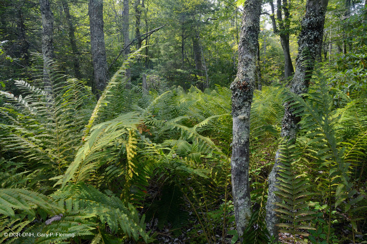 Dương xỉ quế cao đầu (Osmundastrum cinnamomeum) trong một đầm lầy lõm rừng trên những căn hộ giữa đầu nguồn của Wilson Creek và Little Wilson Creek trên Núi Warm Springs, Quận Bath. Khu bảo tồn thiên nhiên Warm Springs Mountain Preserve. © DCR-DNH, Gary P.Fleming