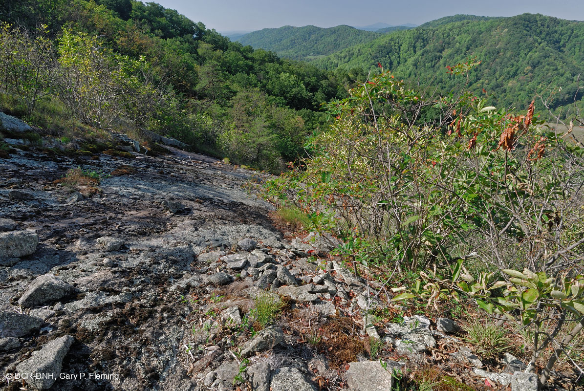 Cây bụi rìa (Chionanthus virginicus) trong rừng mở trên các mỏm gneiss granit tẩy tế bào chết, Woods Mountain, Hạt Nelson. Các cây thân thảo thấp bắt rễ trong thảm rêu và địa y rộng lớn bao gồm cây thông (Hypericum gentianoides) và hoa lá tròn(Phemeranthus ter etifolius). Khu bảo tồn thiên nhiên Fortunes Cove Preserve. © DCR-DNH, Gary P.Fleming