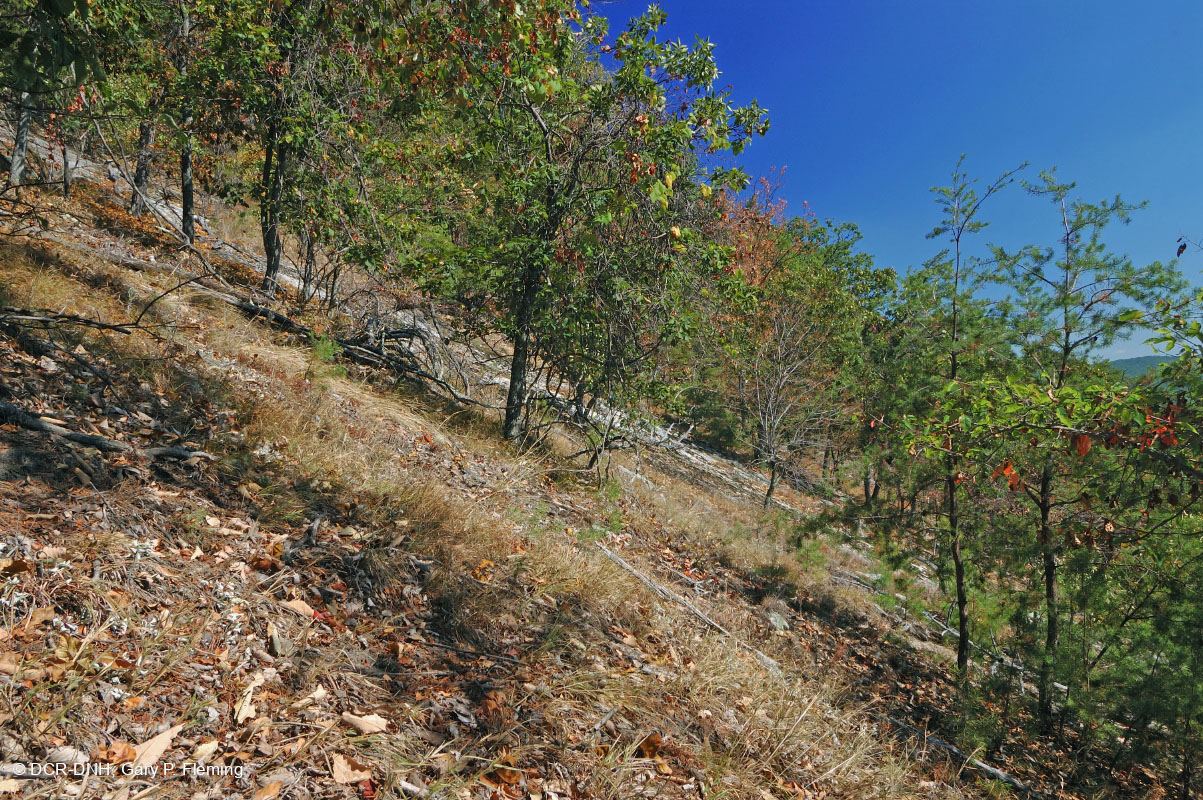 Graminoid hỗn hợp (Carex pensylvanica, Danthonia spicata, Dichanthelium dep auperatum, Sch izachyrium scoparium var. scoparium) dưới cây hickory và thông còi cọc, trên vỉa hè sa thạch dốc ở sườn đông nam của Núi Tinker phía trên Carvins Creek, Hạt Botetourt. Đá sa thạch ở đây hơi vôi, cho phép nhiều loài thực vật sinh sống ở phần mỏm. © DCR-DNH, Gary P.Fleming