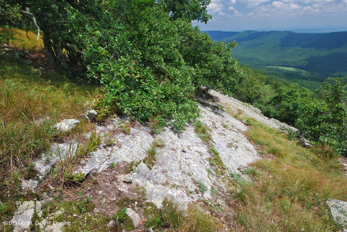 Post oak (Quercus stellata) and Pennsylvania sedge (Carex pensylvanica) are the dominant species in this acidic woodland on a large Silurian sandstone outcrop. Southeastern flank of Walker Mountain, northwest of Pulaski in Pulaski County. Eastern Divide Ranger District, George Washington & Jefferson National Forests. © DCR-DNH, Gary P. Fleming