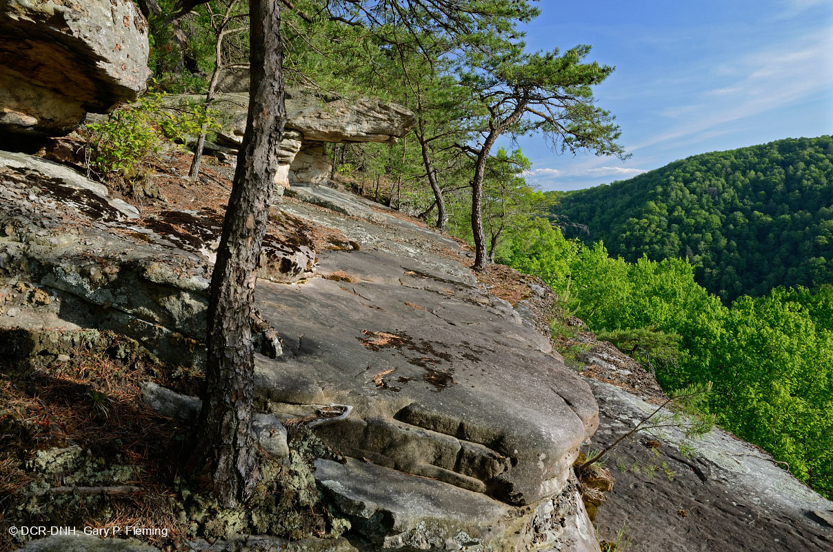 Các vỉa hè trên vách đá sa thạch ở Hẻm núi Russell Fork ở Hạt Dickenson hỗ trợ các khu rừng thông Virginia (Pinus virginiana), cây bụi rải rác và các loại cây thân thảo thưa thớt mọc trong các vết nứt và kẽ hở. Breaks Interstate Park. © DCR-DNH, Gary P.Fleming