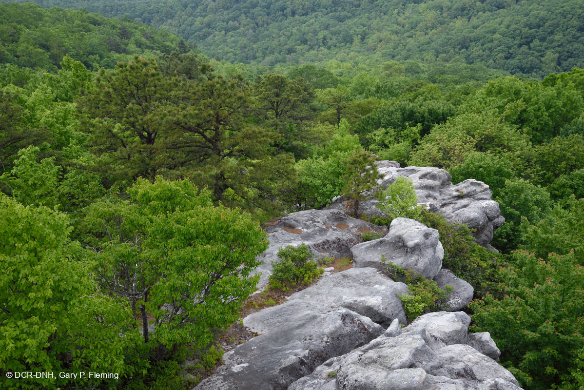 Đỉnh vách đá sa thạch với cây thông bụi (Pinus rigida) /rừng cây thạch nam. Tại Birch Knob, Hạt Dickenson, elev. 3149 ft., điểm cao nhất trên Núi Pine, tạo thành biên giới giữa Virginia và Kentucky. Quận Clinch Ranger, George Washington & Rừng Quốc gia Jefferson. © DCR-DNH, Gary P.Fleming