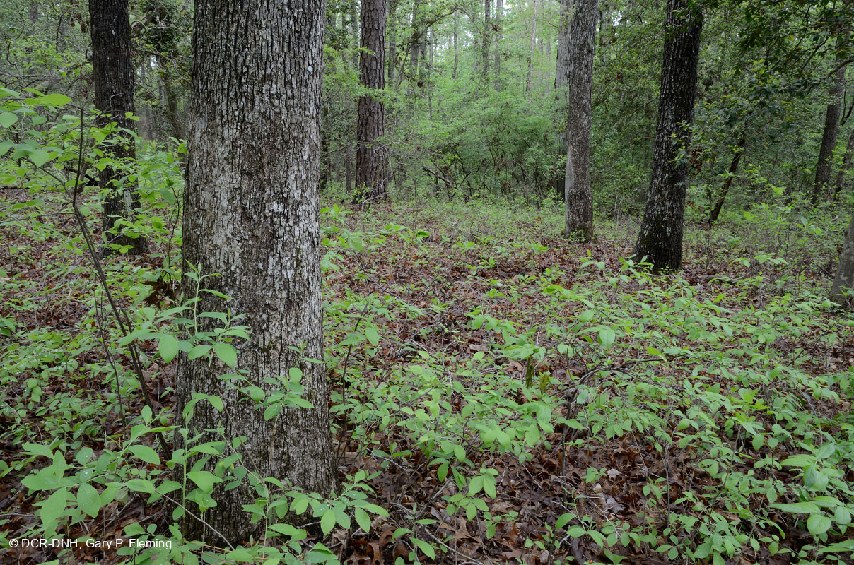 Một khu rừng sồi/thạch nam khô cằn, cằn cỗi gồm sồi trắng (Quercus alba), sồi đỏ phía nam (Quercus falcata) và một số thông loblolly (Pinus taeda) trên những bụi cây kim ngân (Gaylussacia frondosa). Trên vùng cao nguyên nhấp nhô của Đồng bằng ven biển phía trong Quận Caroline, Khu bảo tồn quân sự Fort AP Hill. © DCR-DNH, Gary P. Fleming