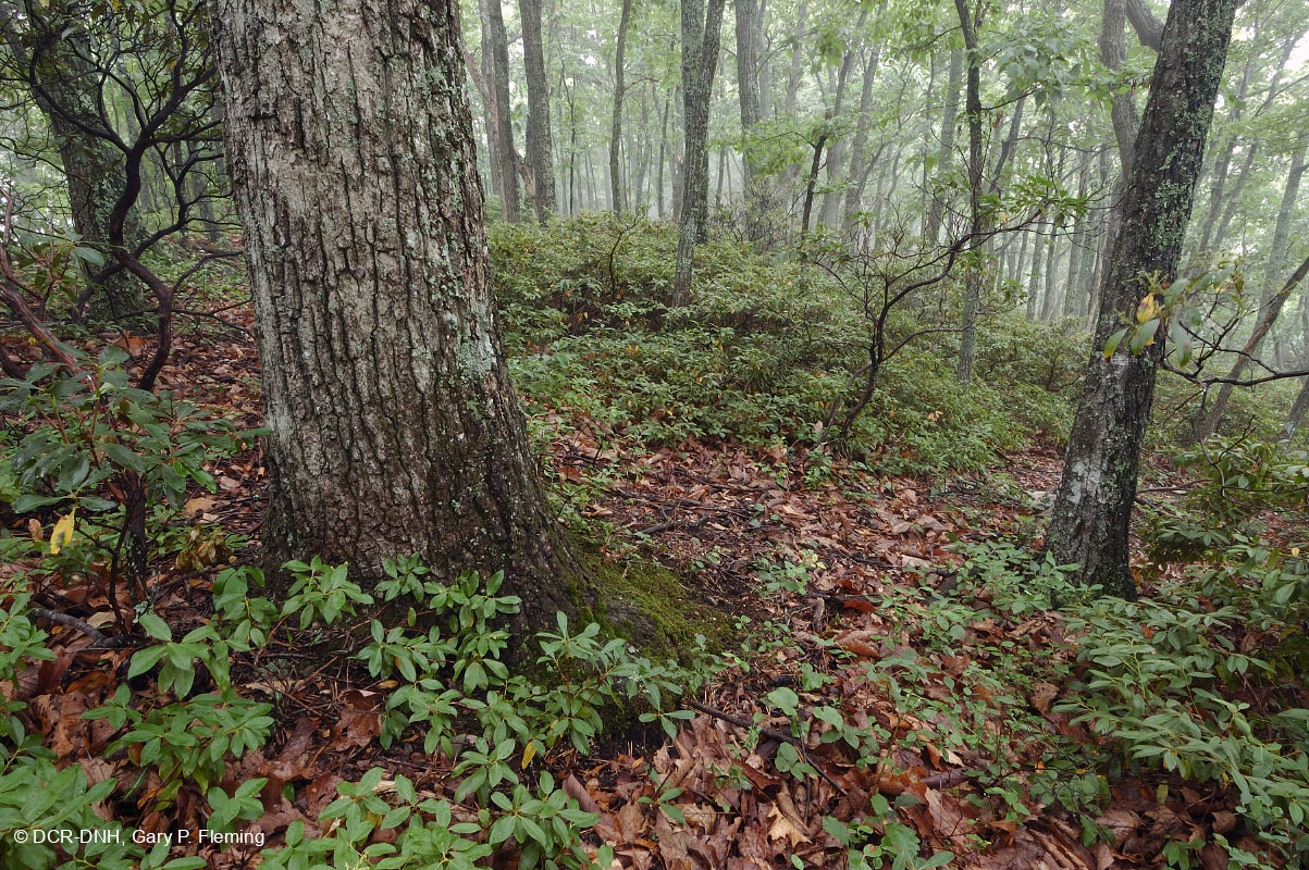 Rừng sồi hạt dẻ Trung Appalachian / Nội Piedmont trên sườn tây bắc của Núi Brushy phía trên Suối Carvin, Quận Roanoke. Cây bụi núi thường xanh (Pieris floribunda) thay thế cây nguyệt quế núi để trở thành cây bụi chiếm ưu thế trong khu vực này. © DCR-DNH, Gary P. Fleming