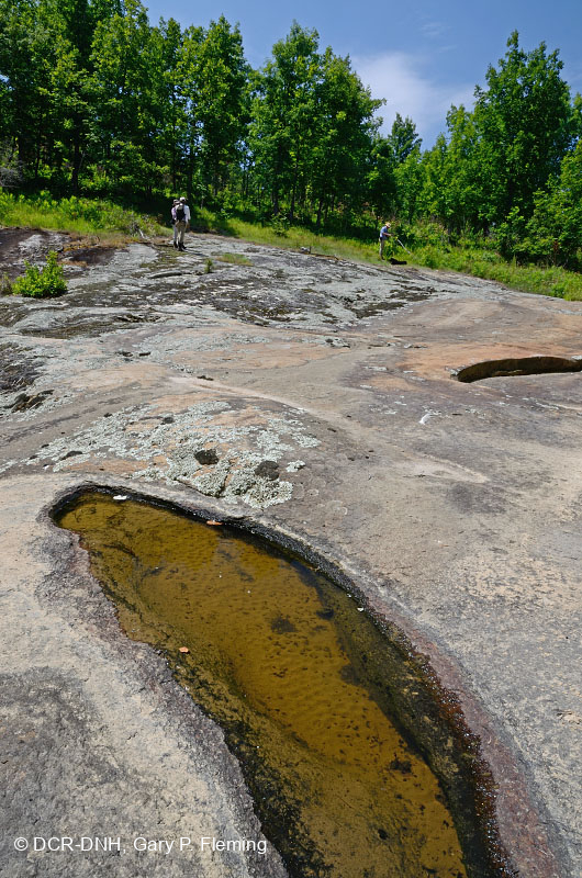 Chế độ xem mặt đất của cùng một tảng đá phẳng được hiển thị trong ảnh trước. Đá phẳng granit thường có các vũng cạn, tạm thời, cũng như thảm rêu, tích tụ sỏi và các túi đất mỏng nơi thực vật có mạch có thể ra rễ. © DCR-DNH, Gary P.Fleming
