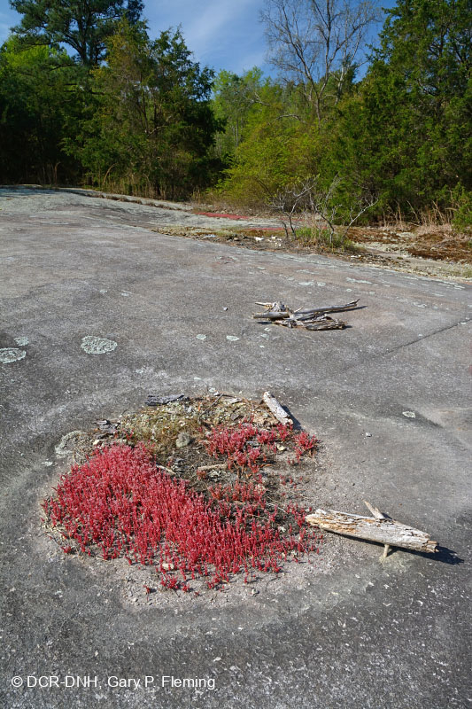 Thực vật có mạch thưa thớt hoặc không có trên các khu vực rộng lớn của đá phẳng granit. Ở đây, cây đá Small's mọng nước (Diamorpha smallii) bị hạn chế trong một ổ gà nhỏ nơi hơi ẩm tích tụ. Khu bảo tồn thiên nhiên Gasburg Granite Flatrocks Preserve, Hạt Brunswick. © DCR-DNH, Gary P.Fleming
