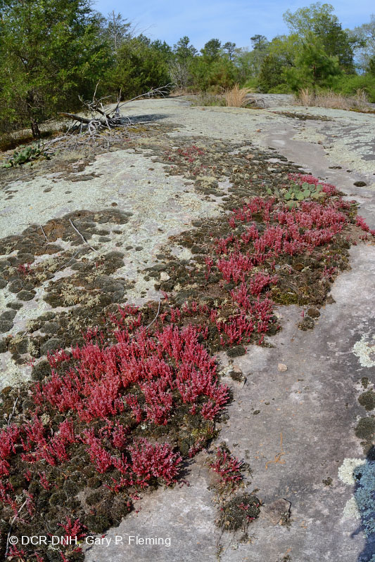 Bryophyte Grimmia laevigata và cây đá nhỏ (Diamorpha smallii) mọng nước có mạch (Diamorpha smallii) tụ tập trong một đầm lầy bằng đá phẳng, nơi độ ẩm phù du dồi d ào hơn. Khu bảo tồn thiên nhiên Grasburg Granite Flatrocks Preserve, Hạt Brunswick. © DCR-DNH, Gary P.Fleming