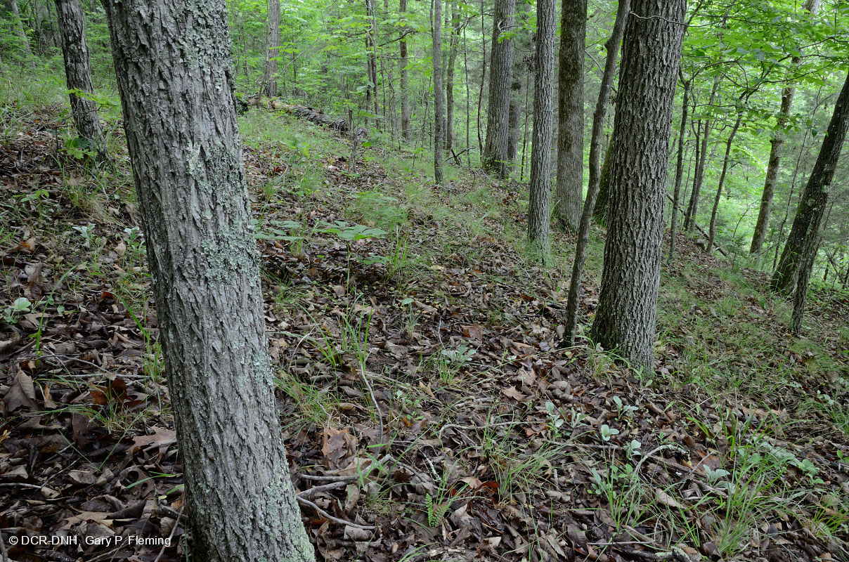 Pignut hickory (Carya glabra) - khu vực chiếm ưu thế của Rừng Hardpan Nam Piedmont trên một sườn đá phù sa vôi dọc theo sông Banister gần Đồi Cedar, Hạt Pittsylvania. Cỏ kim phương đông (Piptochaetium avenaceum) chiếm ưu thế trong lớp thảo mộc. © DCR-DNH, Gary P.Fleming