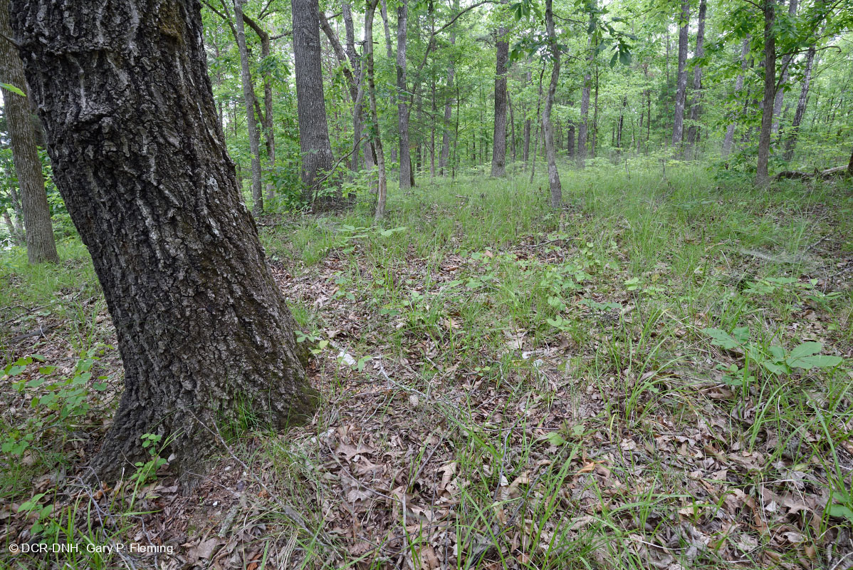 Các khu rừng lớn nhất được biết đến của Rừng Hardpan Nam Piedmont, tổng cộng là vài trăm mẫu Anh, xuất hiện trên vùng cao thoai thoải dưới đáy bởi đá biến chất mafic và đá phiến ở đông nam Quận Halifax. Giá đỡ được hiển thị ở đây là một trong những cây trưởng thành nhất và ít bị xáo trộn nhất, với lớp lót thưa thớt và một lớp thảo mộc chủ yếu là cỏ kim phía đông (Piptochaetium avenaceum) và nutrush đầu nhỏ (Scleriaoligantha). © DCR-DNH, Gary P.Fleming