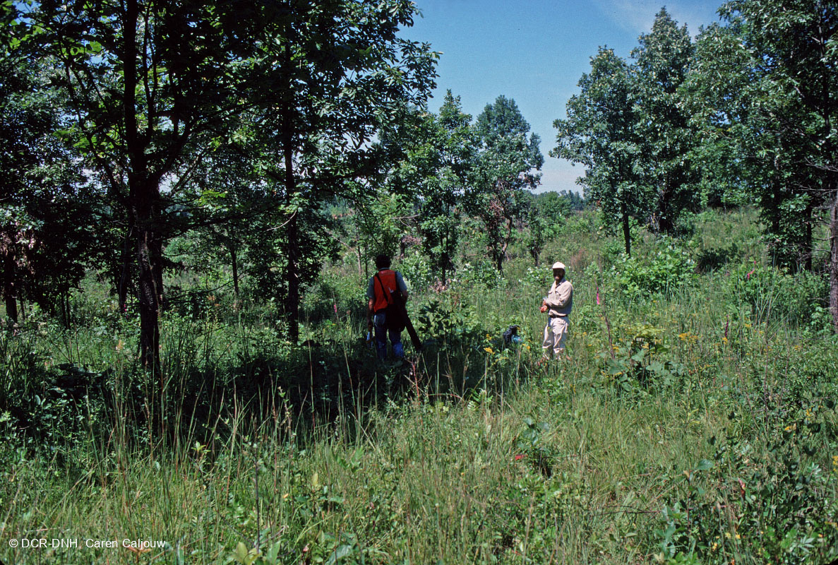 Các nhà sinh thái học DCR-DNH đang thu thập dữ liệu lô đất ở thảo nguyên sồi-hickory Fort Pickett vào tháng 8 1994. Hệ thống thoát nước Birchin Creek, Quận Nottoway. © DCR-DNH, Caren Caljouw