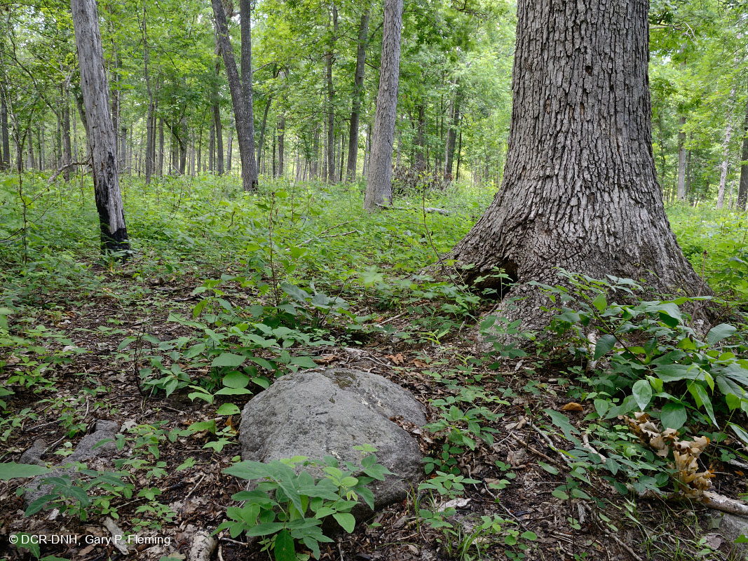 Đất đá màu mỡ bị phong hóa từ các con đê và bệ đá diabase trong khu vực huấn luyện Fort Pickett hỗ trợ cho rừng sồi-hickory cơ bản. Những loại đất này có lớp thảo mộc có nhiều cây thân thảo hơn và có tính đa dạng cao hơn so với những loại đất có tính axit. © DCR-DNH, Gary P. Fleming