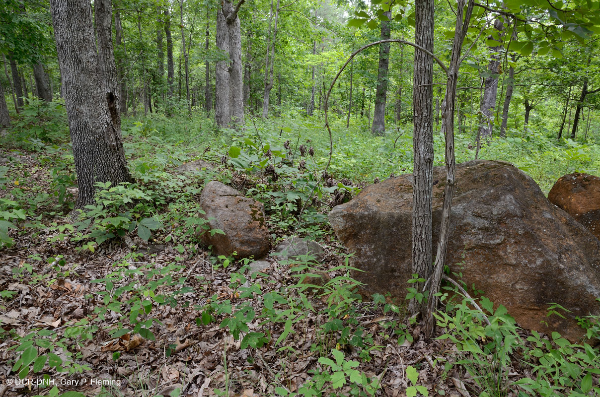 Những tảng đá diabase nhuộm sắt và thảm thực vật đa dạng trong rừng cây sồi hickory cơ bản tại Fort Pickett. Hệ thống thoát nước Tommeheton Creek, Hạt Dinwiddie. © DCR-DNH, Gary P.Fleming