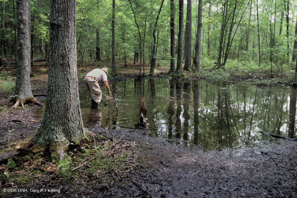 Một trong số những đầm lầy thấp vùng cao chiếm ưu thế của sồi liễu (Quercus phellos) trong rừng phẳng gần sông Piney ở Hạt Amherst. Các vùng đất ngập nước được phát triển trên anorthosite, một loại đá mácma xâm nhập vào đất bằng đất sét cứng. Cả đầm lầy thấp và đầm lầy lõm đều khá bất thường ở vùng xa về phía tây này ở Piedmont, thực tế ở chân Blue Ridge. © DCR-DNH, Gary P.Fleming
