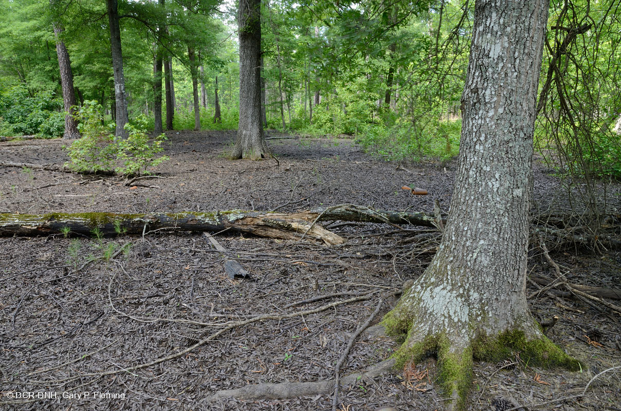 Một đầm lầy đất trũng lớn, hoàn toàn bị cắt bỏ của cây sồi liễu (Quercus phellos) trong rừng phẳng diabase tại Khu bảo tồn quân sự Fort Pickett. Lửa từ các cuộc tập trận quân sự thường xuyên cháy lan đến tận rìa vùng đất ngập nước. Hệ thống thoát nước của Suối Tommeheton, Quận Dinwiddie. © DCR-DNH, Gary P. Fleming