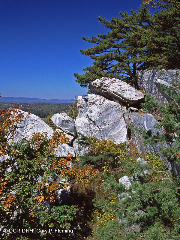 Một cây thông núi trên bàn cũ (Pinus pungens) trên Vách đá High Point ở dãy núi Bull Run, Quận Fauquier. Cây này đã có tuổi đời > 200 năm. Khu bảo tồn Khu vực Tự nhiên Bang Bull Run Mountains. © DCR-DNH, Gary P.Fleming
