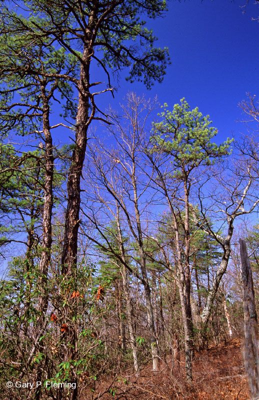 Cây thông nhựa cao, hình thành tốt (Pinus rigida) trong rừng thông-sồi/thạch nam trên sườn núi High Point gần Thoroughfare Gap, dãy núi Bull Run, Quận Fauquier. Khu bảo tồn thiên nhiên tiểu bang Bull Run Mountains. © Gary P. Fleming