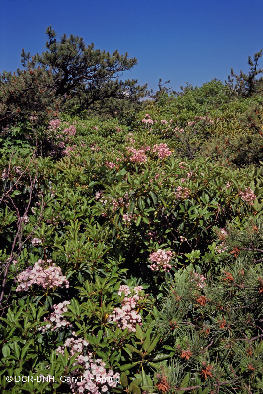 Cây thông lùn và rất dày đặc (Pinus rigida) /rừng cây hỗn hợp trên Bald Knob, Núi Warm Springs, phía nam Healing Springs ở Quận Bath. Khu bảo tồn núi mùa xuân ấm áp của Bảo tồn Thiên nhiên. © DCR-DNH, Gary P.Fleming