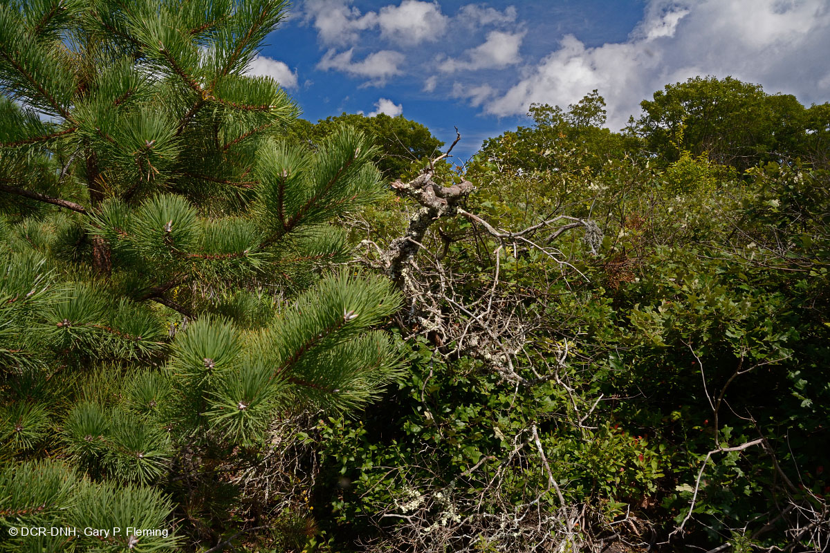 Bụi cây sồi gấu (Quercus ilicifolia) và thông nhựa (Pinus rigida) rậm rạp trong rừng thông-sồi/thạch nam mới bị cháy trên Núi Warm Springs, phía bắc Ingalls Field, Quận Bath. Khu bảo tồn núi Warm Springs của tổ chức Nature Conservancy. © DCR-DNH, Gary P. Fleming