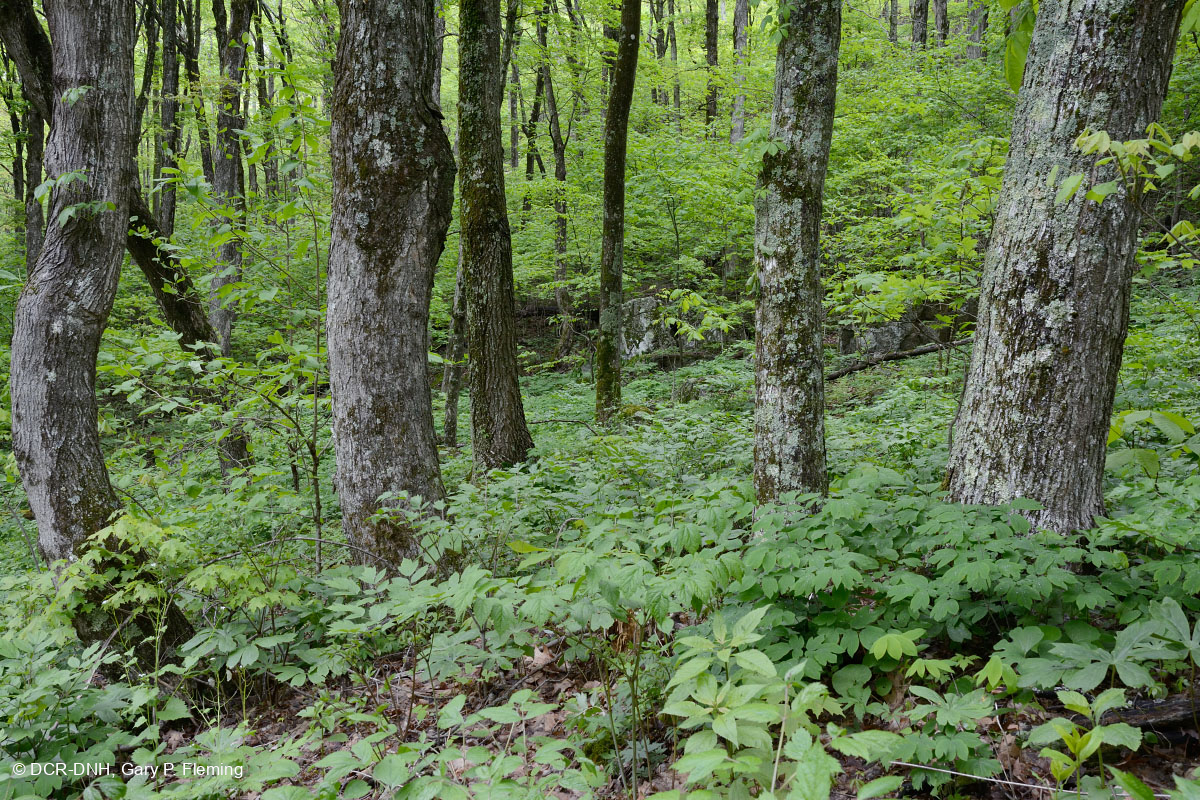 Một con dốc dốc, đá, quay mặt về phía tây bắc dọc theo Blue Ridge Parkway gần Gap sông Tye (Hạt Rockbridge) hỗ trợ một khu vực già của cộng đồng Rừng Rich Cove Trung Appalachian (Sugar Maple - Loại Basswood), với cây phong đường chiếm ưu thế (Acer saccharum) lên đến khoảng 90 CM DBH. © DCR-DNH, Gary P.Fleming