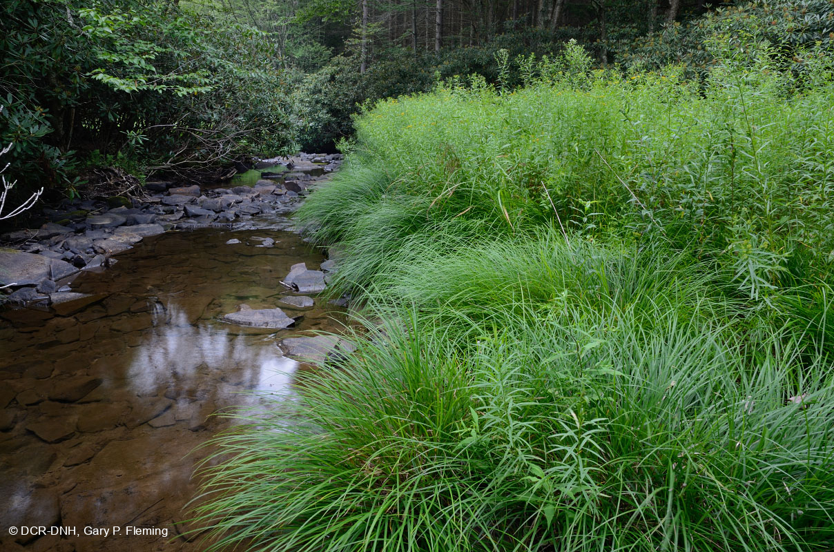 Những chiếc ngòi dày đặc của cói xoắn (Carex torta), với cây vàng lá cỏ (Euthamia graminifolia) phía sau chúng, trên một thanh đá dọc theo Laurel Fork, ở chân tây của Sapling Ridge trên núi Allegheny, Quận Highland. © DCR-DNH, Gary P.Fleming