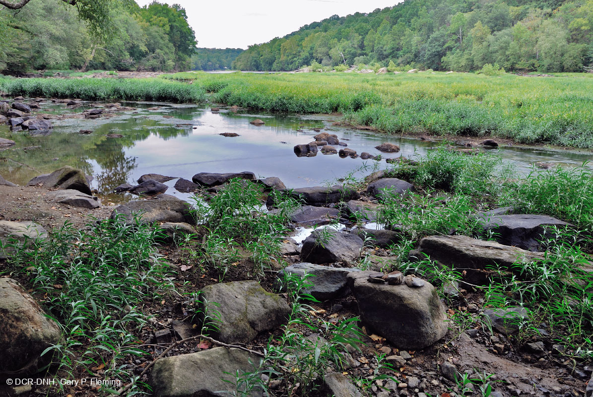 Các khu vực rộng lớn của kiểu cộng đồng thanh đá liễu nước (Justicia americana) lộ ra ở mực nước thấp ở sông Rappahannock gần Đồi Embry, phía tây Fredericksburg thuộc Hạt Stafford. © DCR-DNH, Gary P.Fleming