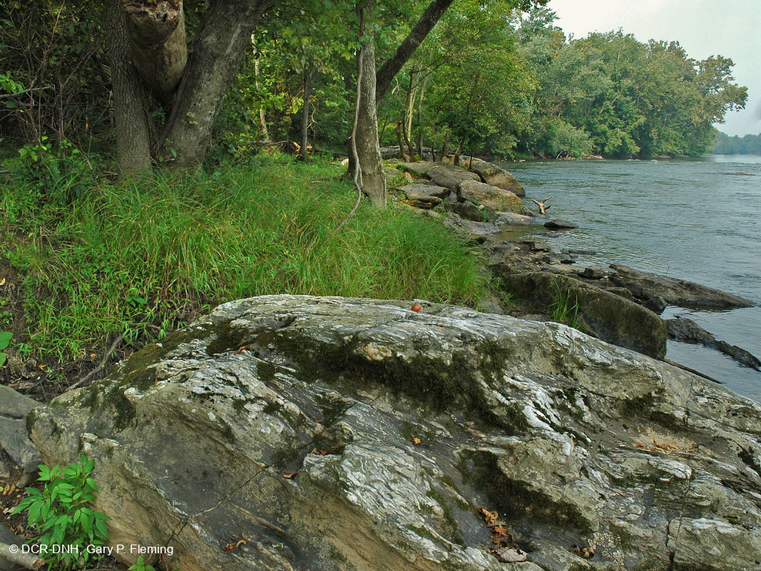 Rừng Scor Floodplain Floodplain Piedmont/ Central Appalachian Bedrock xảy ra trên các bờ sông có độ dốc cao, nơi các lớp đá nền kéo dài lên thềm kênh. Đứng này xảy ra tại một điểm đá dọc theo sông Potomac ở Công viên Riverbend (Quận Fairfax). Cói vô tính lớn phía sau tảng đá là cói của Emory (Carex emoryi). Lưu ý khúc gỗ khổng lồ, bị lũ lụt chìm giữa hai cây ở góc trên bên trái của bức ảnh. © DCR-DNH, Gary P.Fleming