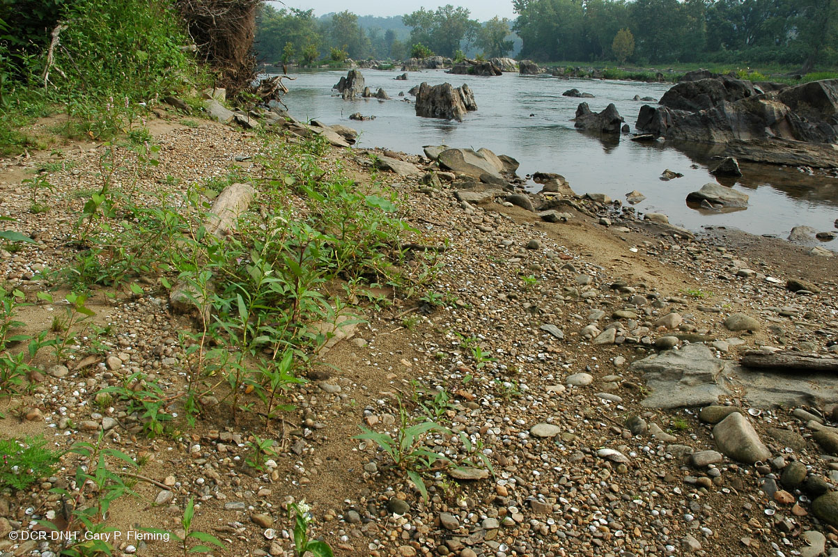 Dải cát lộ thiên và sỏi mịn hỗ trợ thảm thực vật thân thảo thưa thớt với sự thống trị của các loài cây thông lá kim (Persicaria spp.). Bờ sông Potomac ở Công viên Riverbend, Quận Fairfax. © DCR-DNH, Gary P. Fleming