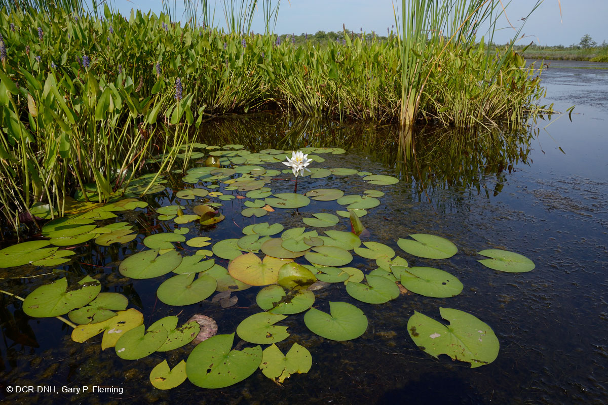 Thảm bèo trắng (Nymphaea odorata ssp. odorata) nổi là loài thực vật dễ thấy nhất ở tầng nước ít muối này, nhưng thực vật chìm của rêu sừng (Ceratophyllum demersum) lại phong phú hơn. Dọc theo Milldam Creek, một nhánh của sông North Landing, Thành phố Virginia Beach. © DCR-DNH, Gary P. Fleming