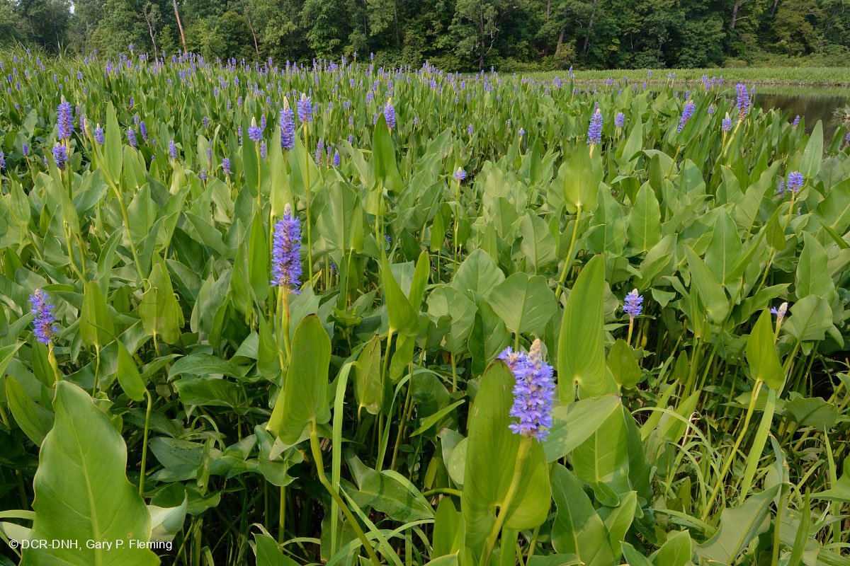 Cây rau ngót (Pontederia cordata var. cordata) là loài đặc trưng của vùng đầm lầy nước ngọt thủy triều, thường mọc ở độ cao tương đối thấp trong đầm lầy và gần rìa kênh, ra hoa vào tháng 6. Suối Ashton, Quận Chesterfield, Công viên Point of Rocks. © DCR-DNH, Gary P. Fleming