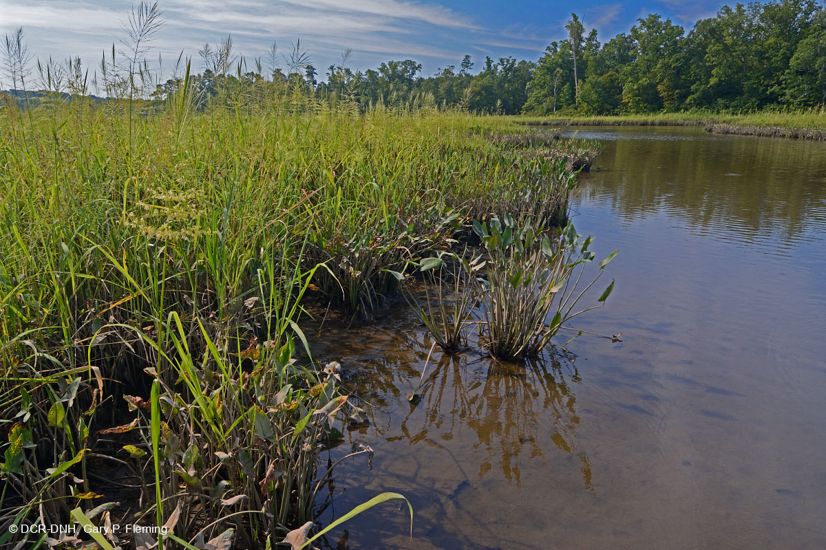 Khía cạnh cuối mùa hè của đầm lầy Ashton Creek ở Hạt Chesterfield, với lúa dại cao (Zizania aquatica var. aquatica) chiếm ưu thế áp đảo; loài này sẽ mới nảy mầm và hầu như không đáng chú ý trong cùng một khu vực vào đầu tháng 6. Công viên Point of Rocks © DCR-DNH, Gary P.Fleming