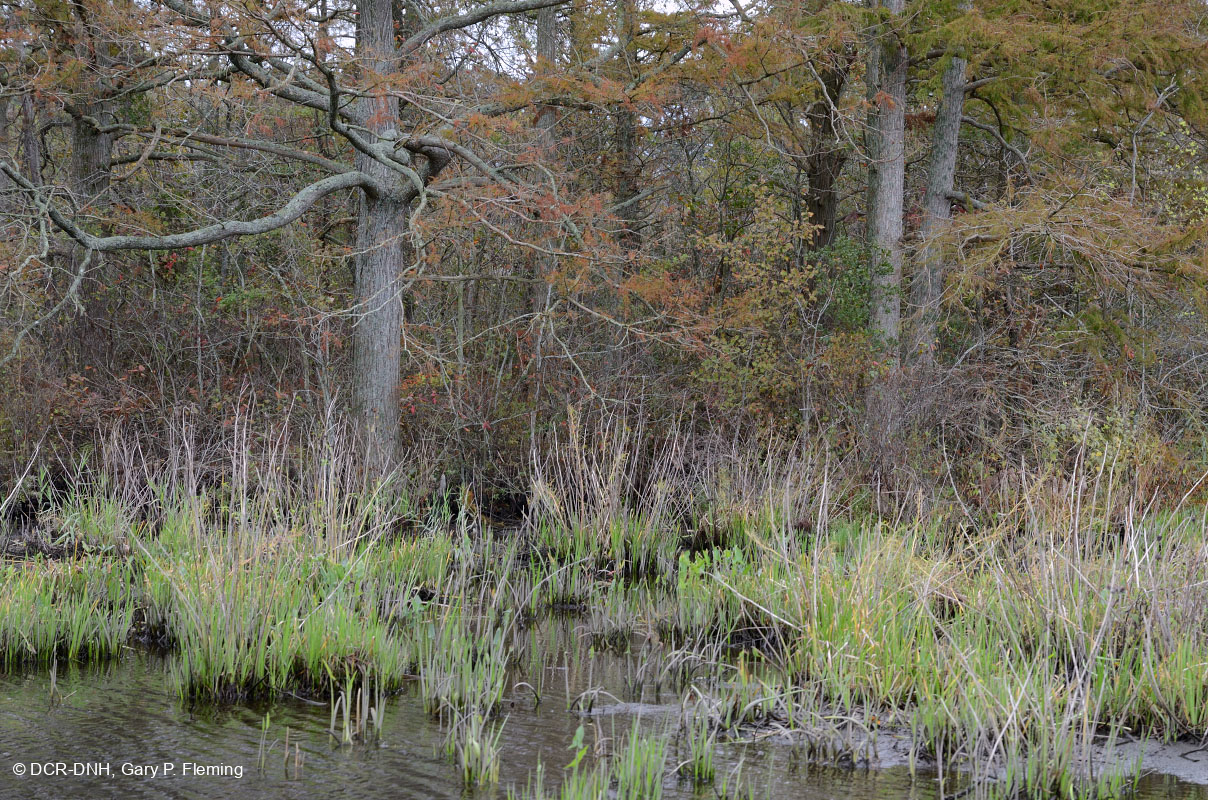 Cây bách hói (Taxodium distichum) biệt lập trong đầm lầy gỗ cứng thủy triều do cây tần bì bí ngô (Fraxinus profunda) thống trị. Dọc theo phần thượng lưu của Pitts Creek ở phía bắc Quận Accomack. © DCR-DNH, Gary P. Fleming