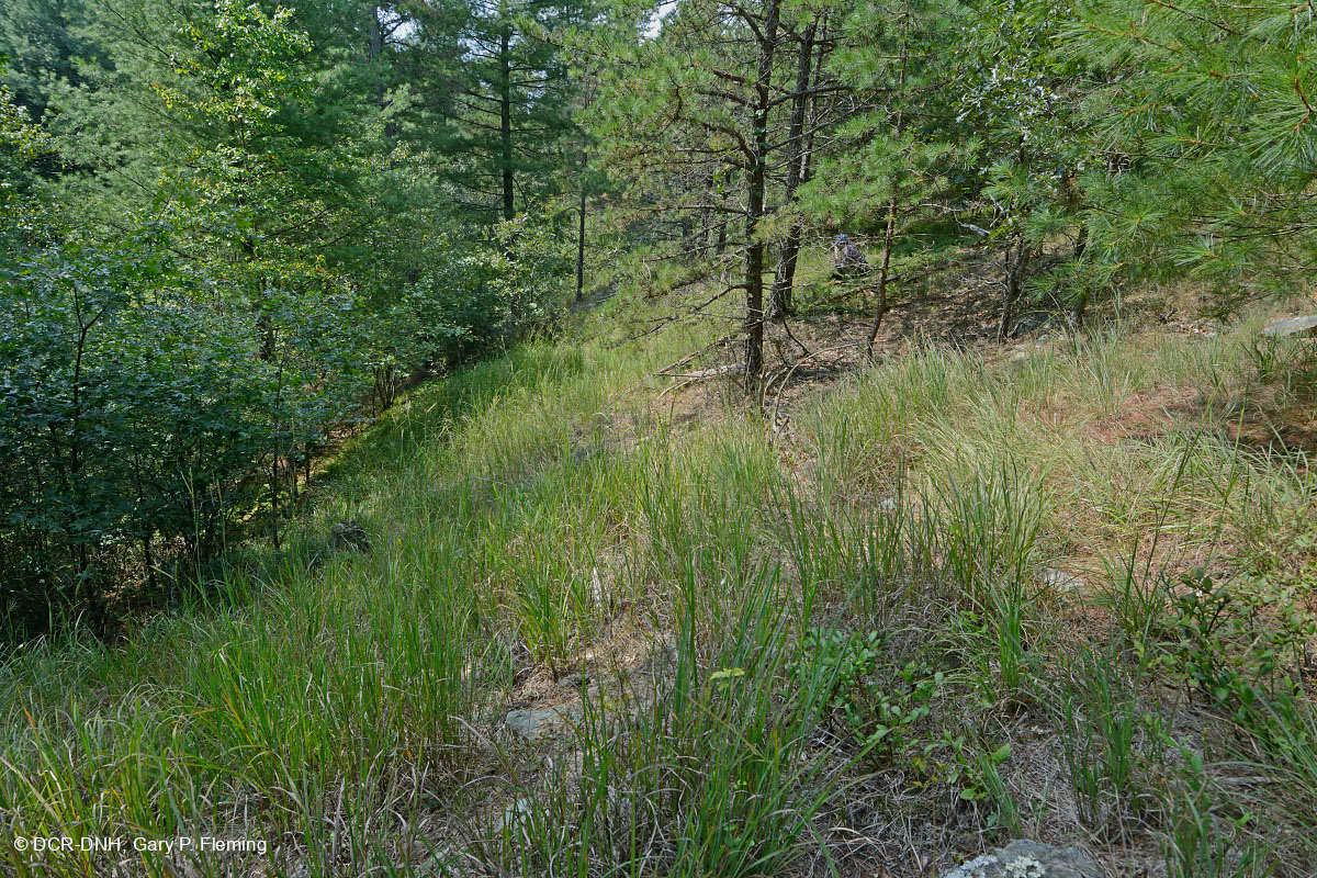 Một trong số rất ít các gốc cây còn sót lại của rừng siêu đẹp miền Nam Blue Ridge, đặc trưng bởi các loại cỏ mùa ấm dưới gốc thông trống (Pinus rigida),thông trắng (Pinus strobus) và sồi sau(Quercus stellata). Trên một con dốc quay mặt về phía tây nam được bao phủ bởi phiến đá talc-tremolite và nằm dưới Chestnut Creek ở vùng The Glades thuộc đông nam Quận Grayson. © DCR-DNH, Gary P.Fleming
