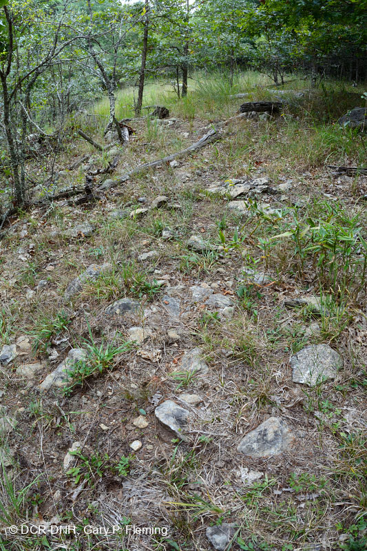 Đá phiến sét talc-tremolite, nhiều loại graminoid và cây sồi bụi rậm (Quercus stellata) trong Rừng siêu mafic Blue Ridge phía Nam dọc theo Chestnut Creek, ở vùng The Glades thuộc đông nam Quận Grayson. © DCR-DNH, Gary P. Fleming