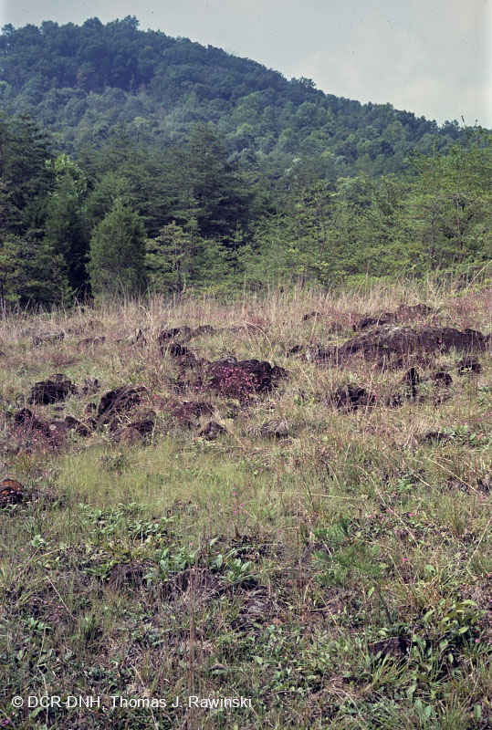 Cỏ thấp và thảm thực vật rậm giữa những mỏm đá phiến siêu đẹp ở một khu vực cằn cỗi gần Jacks Creek ở Quận Franklin. Núi Jacks ở hậu cảnh. © DCR-DNH, Thomas J.Rawinski