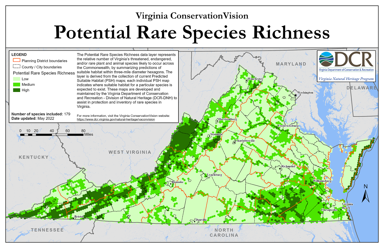 Lớp dữ liệu về Sự phong phú của các loài quý hiếm tiềm năng thể hiện số lượng tương đối các loài thực vật và động vật bị đe dọa, nguy cấp và/hoặc quý hiếm của Virginia có khả năng xuất hiện trên khắp Khối thịnh vượng chung, bằng cách tóm tắt các dự đoán về môi trường sống phù hợp trong các hình lục giác có đường kính ba dặm. Lớp này được lấy từ bộ sưu tập các bản đồ Môi trường sống thích hợp được dự đoán (PSH) hiện tại; mỗi bản đồ PSH riêng lẻ chỉ ra nơi dự kiến có môi trường sống thích hợp cho một loài cụ thể. Các bản đồ này được Sở Bảo tồn và Giải trí Virginia - Sở Di sản Thiên nhiên (DCR-DNH) phát triển và duy trì nhằm hỗ trợ bảo vệ và lập danh mục các loài quý hiếm ở Virginia. Lớp bảo tồn các loài quý hiếm tiềm năng là một trong số nhiều mô hình lập kế hoạch bảo tồn và mô hình ưu tiên do DCR-DNH và các đối tác phát triển, được gọi chung là Virginia ConservationVision.