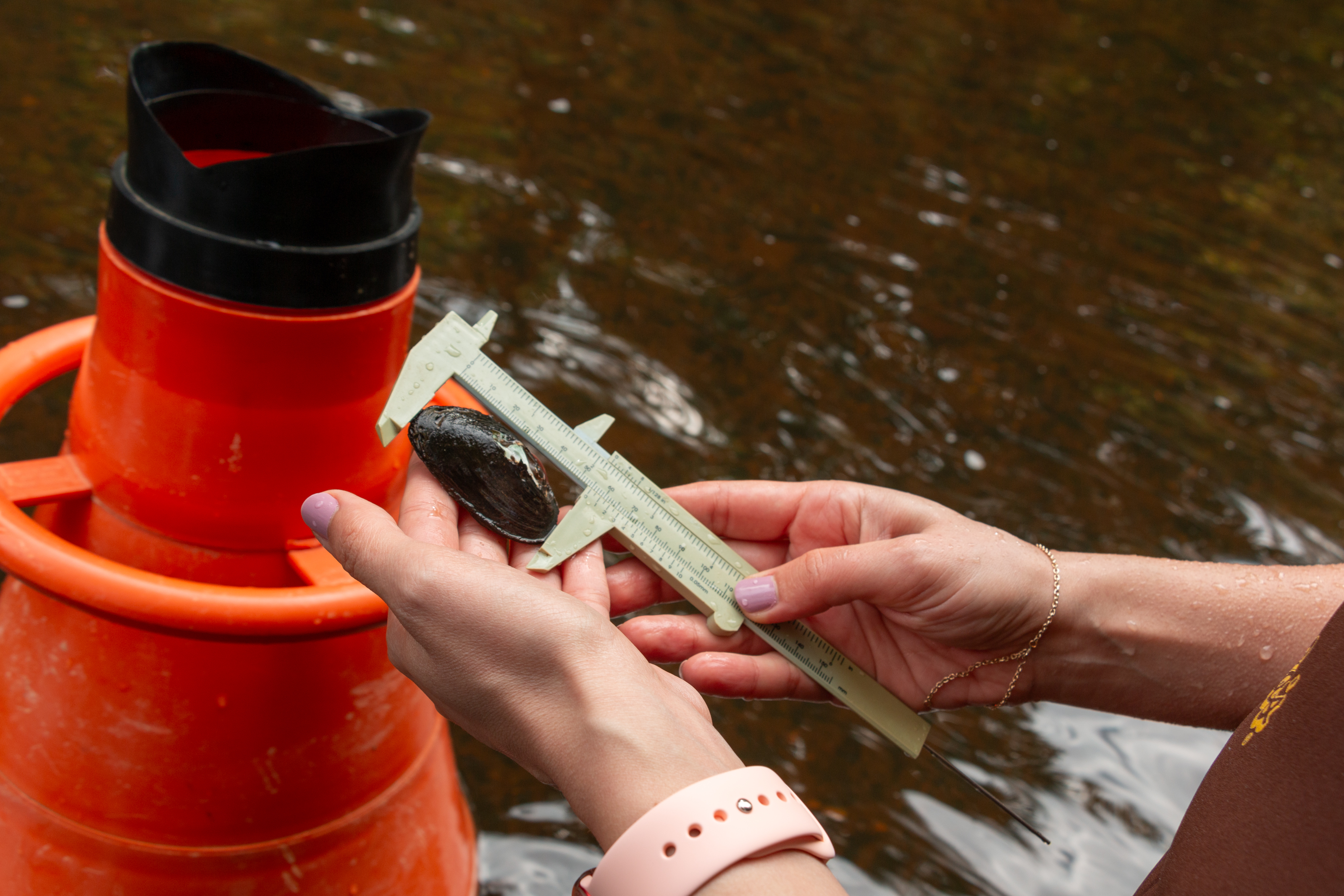(Biên tập viên: Nhấp vào liên kết này để tải xuống hình ảnh. Chú thích ảnh: Nhân viên Chương trình Di sản Thiên nhiên Virginia đang đo một con trai nước ngọt elliptio phía Đông (Elliptio complanata) ở Sông Nam Anna thuộc Quận Hanover. Ảnh của Bộ Bảo tồn và Giải trí.)
