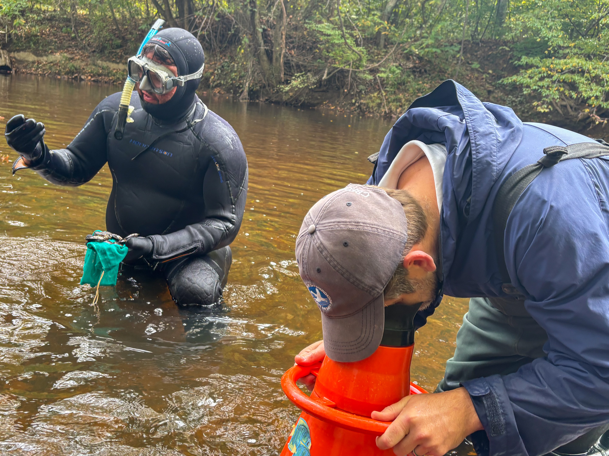 (Biên tập viên: Nhấp vào liên kết này để tải xuống hình ảnh. Chú thích ảnh: Các nhà khoa học từ Bộ Bảo tồn và Giải trí Virginia và Quỹ Vịnh Chesapeake đang lặn bằng ống thở và sử dụng kính ngắm để tiến hành khảo sát trai nước ngọt ở Sông Nam Anna thuộc Quận Hanover. Ảnh của Chesapeake Bay Foundation.)