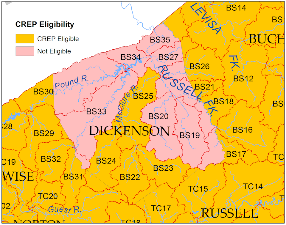 Toàn bộ Virginia, ngoại trừ một số ít đơn vị thủy văn ở Quận Dickenson, hiện đủ điều kiện tham gia CREP. Tuy nhiên, Virginia CREP được chia thành hai khu vực. Chương trình CREP Vịnh Chesapeake nhắm vào toàn bộ lưu vực vịnh của Virginia và kêu gọi trồng 22,000 mẫu Anh vùng đệm ven sông và 3,000 mẫu Anh phục hồi đất ngập nước. Chương trình CREP của Southern Rivers nhắm vào các lưu vực bên ngoài lưu vực thoát nước của vịnh và sẽ thiết lập 13,500 mẫu Anh vùng đệm ven sông cùng với 1,500 mẫu Anh phục hồi đất ngập nước.