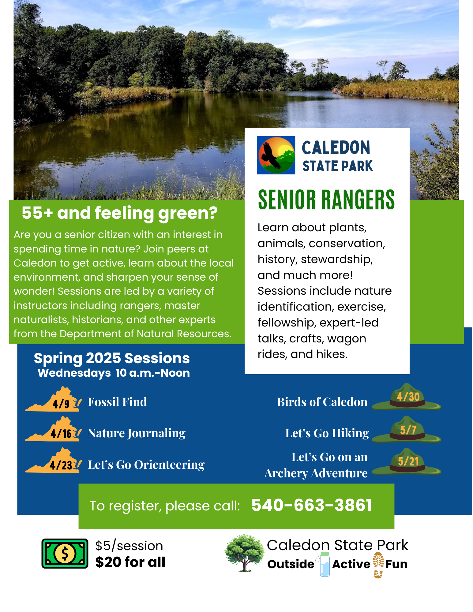 Các kiểm lâm viên cao cấp dự định họp tại Trung tâm du khách vào thứ Tư lúc 10 sáng trong tháng 4 và tháng 5. Hãy đến một hoặc hai lần hoặc tham dự toàn bộ sự kiện! Các phiên họp mùa xuân 2025 bao gồm: