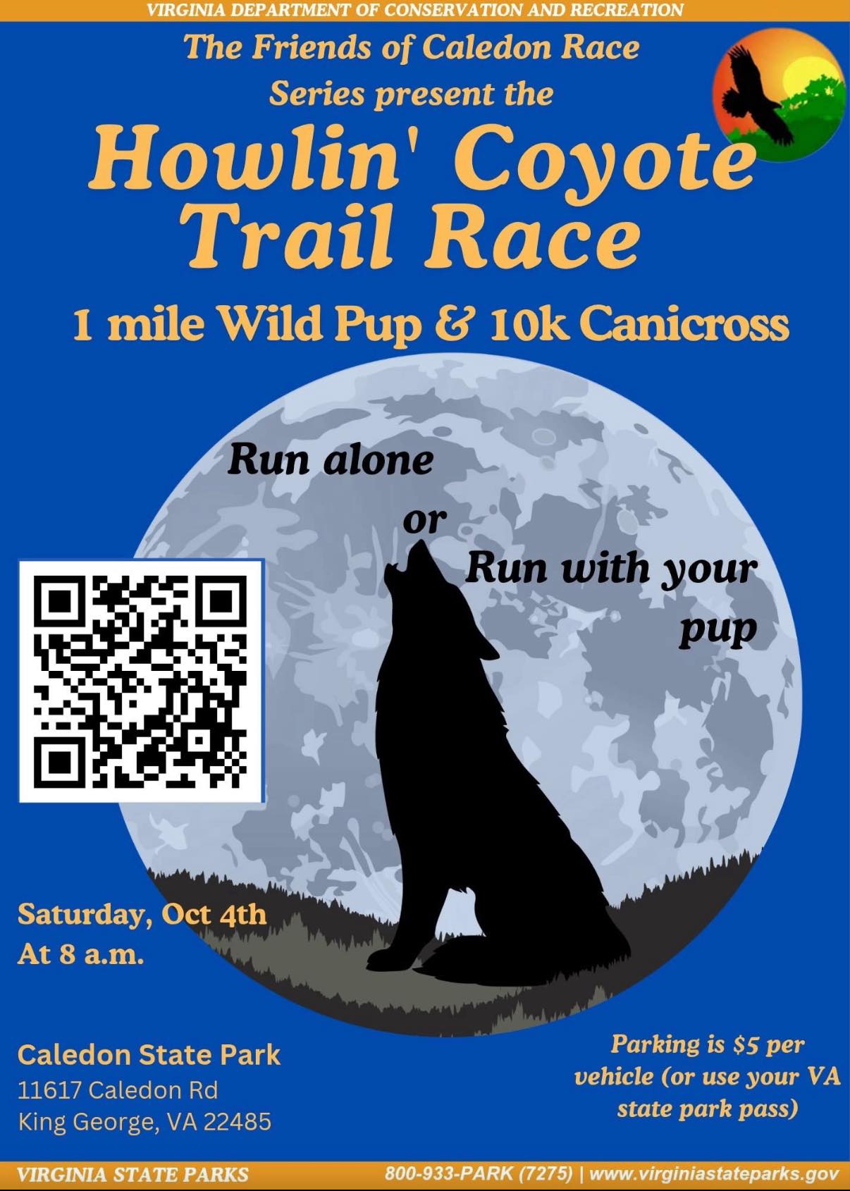 Tham gia loạt Cuộc đua Friends of Caledon cho Howlin Coyote, một sự kiện phi lợi nhuận cho phép vận động viên tận hưởng một cuộc đua đầy thử thách với địa hình khác nhau. Các cuộc đua bao gồm 1 mile Wild Pup và cuộc đua đường mòn 10K Canicross. Đây là một sự kiện thân thiện với chó; đối tác chạy bộ lông xích có dây xích của bạn có thể chạy cùng bạn như một phần của đăng ký trả phí của bạn. Tất cả chó nên được giữ trên dây xích không quá 6 ft; không được phép chạy ngoài dây xích. Cuộc đua này sẽ không có cốc dùng một lần. Mỗi vận động viên sẽ nhận được một SpeedCup - bạn có thể mang theo bên mình khi chạy hoặc mang theo hộp đựng hydrat hóa của riêng bạn. Phí vào cửa của bạn hỗ trợ Friends of Caledon trong việc cải thiện tài nguyên thiên nhiên và các chương trình giáo dục tại Công viên Bang Caledon.