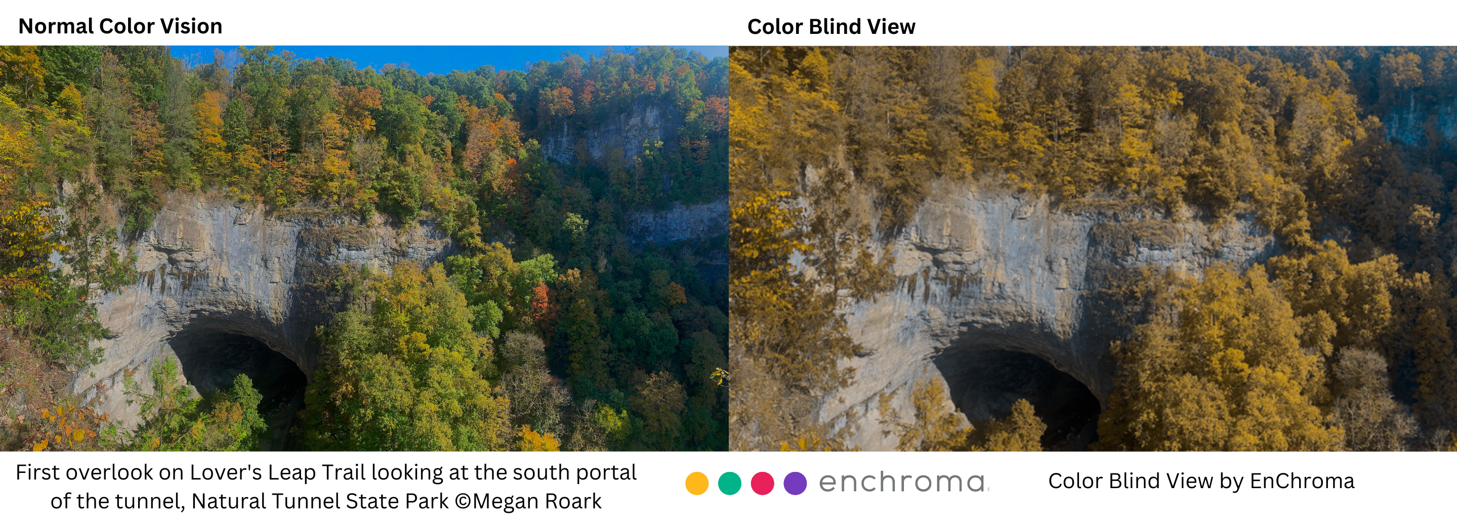 DUFFIELD, VA – Nhằm tôn vinh Tháng nâng cao nhận thức về bệnh mù màu quốc tế, Công viên tiểu bang Natural Tunnel đã hợp tác với EnChroma để tặng hai cặp kính dành cho người mù màu ngoài trời có tròng kính deutan (nhạy cảm với ánh sáng xanh). Kính này đã được chứng minh một cách khoa học là có tác dụng kích thích trung tâm xử lý màu sắc của não và tăng cường thị lực màu cho những người bị khiếm khuyết về thị lực màu.